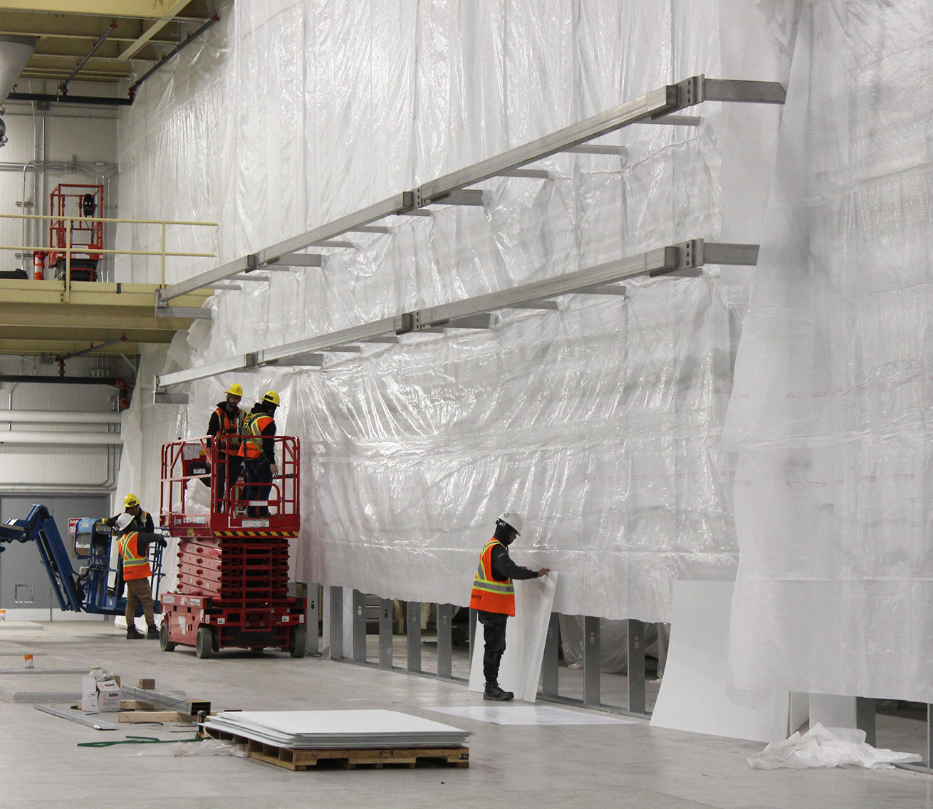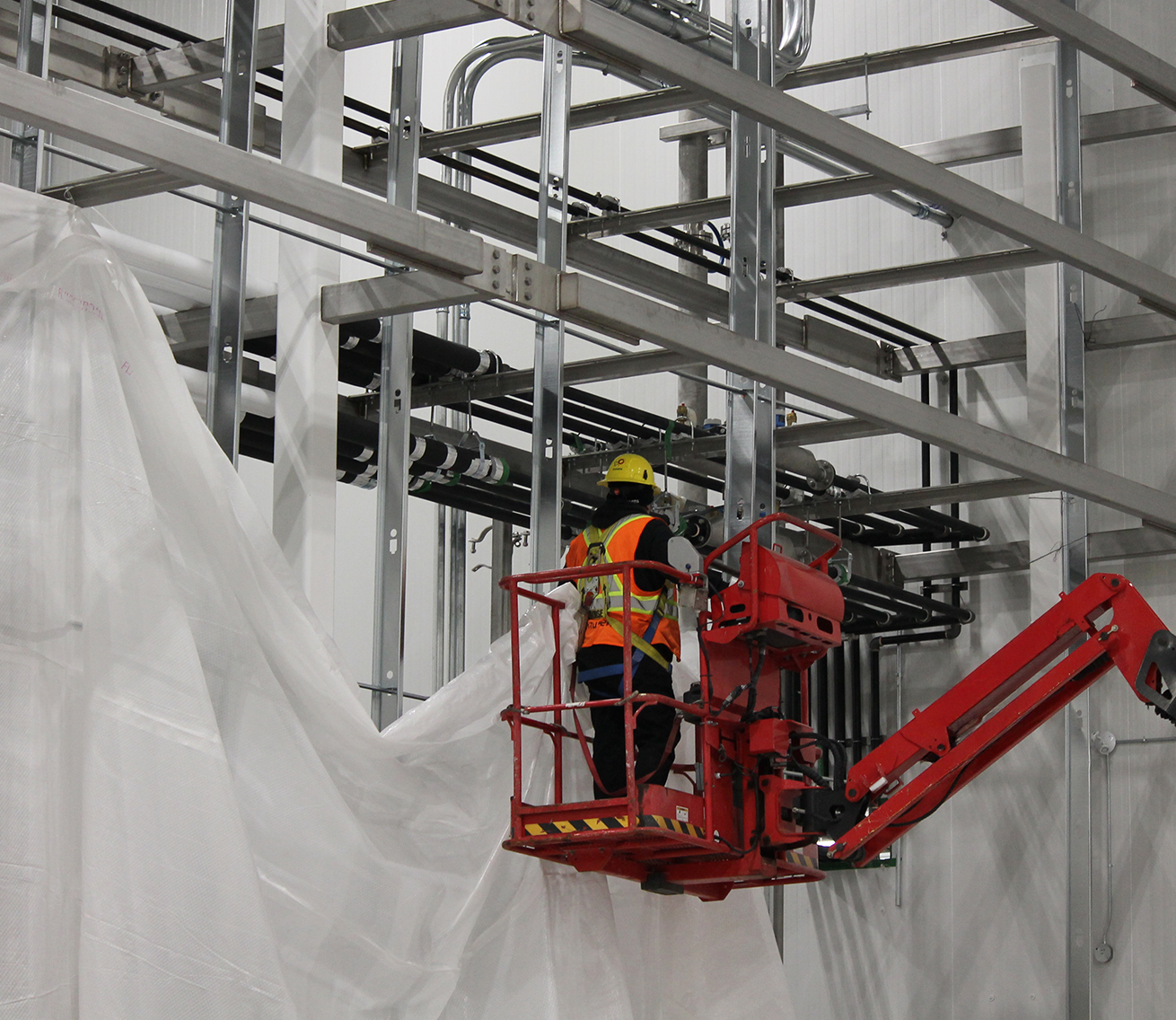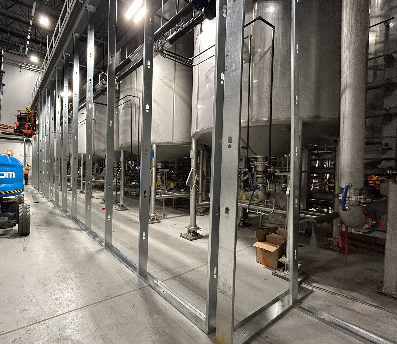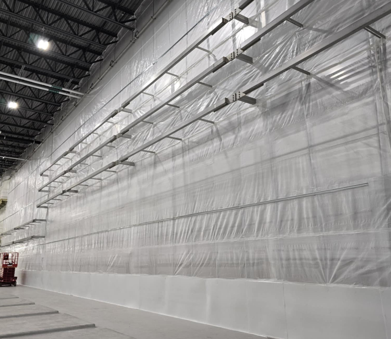 The team mobilized using a Mobile Elevating Work Platform (M.E.W.P.), ensuring efficient access to all necessary areas. The heart of the project lay in constructing an airtight hoarding system, built with steel stud framing and FRP walls, secured with fire-retardant poly sheeting extending to the roof deck. Every component, from the durable steel supports to the braced structures, was installed with meticulous care. To facilitate smooth workflow, multiple access doors were strategically placed, allowing forklifts to pass seamlessly. Hygienic considerations were a top priority—every surface was designed to be fully washable, and all materials were peanut-free to meet the client’s rigorous standards.